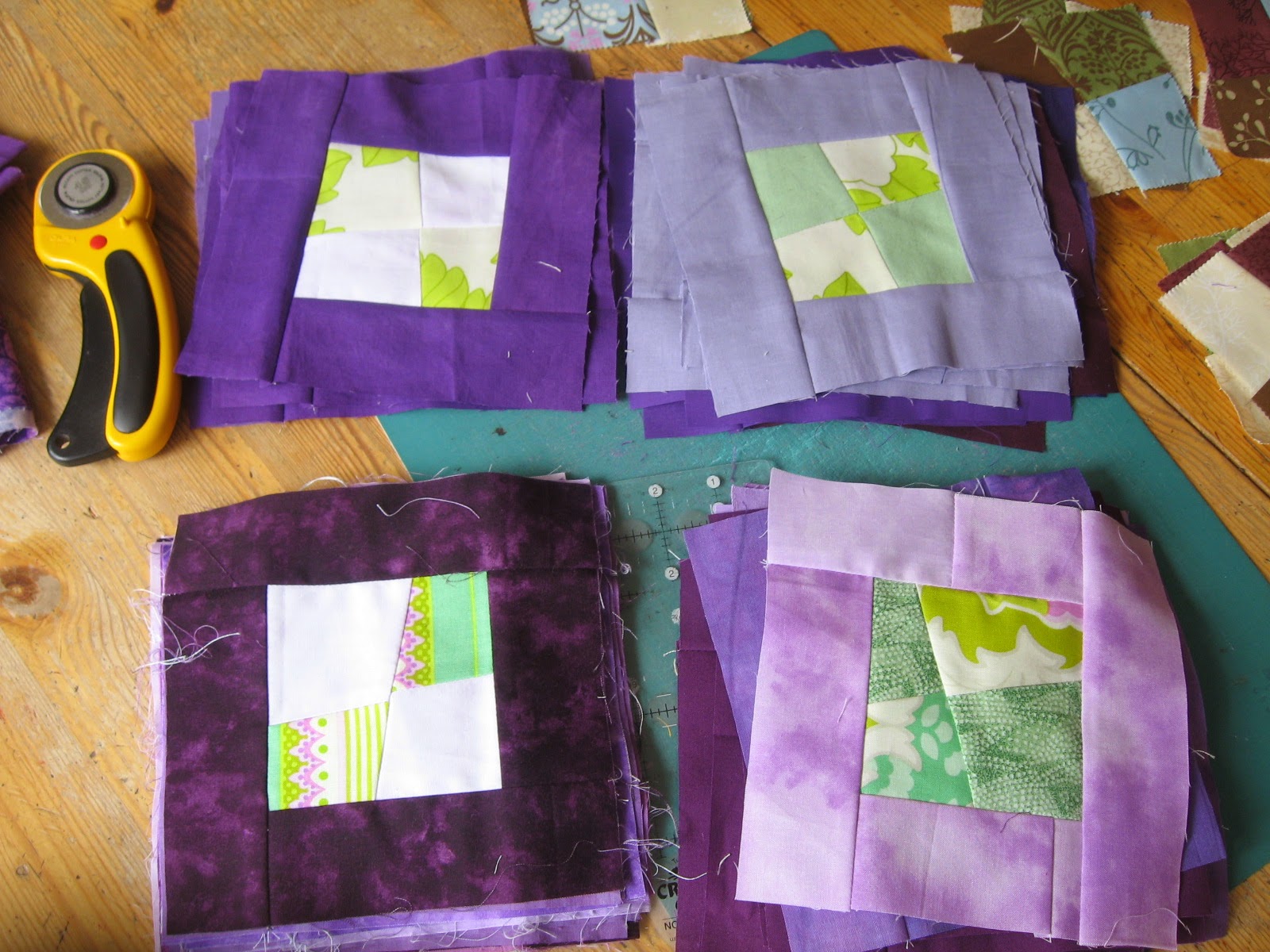 I finished up this set of purple bordered blocks which I started last weekend at the Linus Day - there are 42 of them, measuring 7" (unfinished). Next step is to stitch them together into a top - 6x7 blocks. There are loads of different purples in the borders, as we just used all the purple scraps we could find - and Liz has a lot of scraps and small pieces. In fact, I have loads of purple left over, so I'll be making another set of something purple - apparently teenage girls really like purple, so it's always in demand.