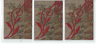 No Cross stitch to show this week as I have been either not home or binding and made very little progress on my stitching. So I'll show it on Friday, when I've got a bit more done as the binding is nearly finished. Instead, some ATCs which have come back finished. I don't have a photo of the start of this one but it was the text background and the brown flower.