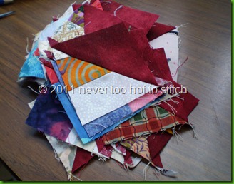 Don't even ask why I had so many of these HST units with the batik stripes - I couldn't tell you. There are getting to be progressively fewer as the months go past and someday, I may even use them all up. At the moment, there are 5 light blue, 19 purple and 38 dark blue. They are 7" blocks.